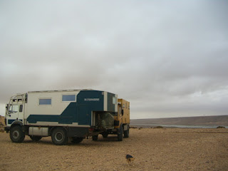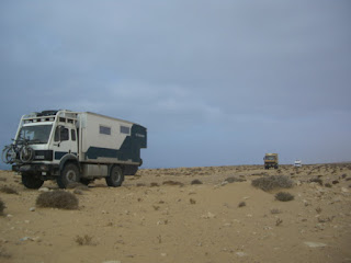 Das scheint Emiline und Olivier allerdings nicht so wichtig zu sein. Nach kurzer Beratschlagung setzten sie in der Dunkelheit die Fahrt nach Tan-Tan fort. Immerhin noch unfgefähr 3 Stunden Fahrt. Warum man das macht, bleibt uns ein Rätsel. Aber vielleicht liegt es daran, das Olivier Reisebusfahrer ist und die sind ja einiges gewöhnt.