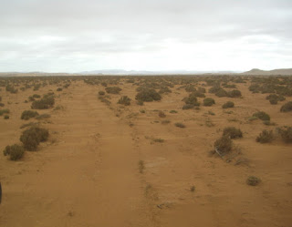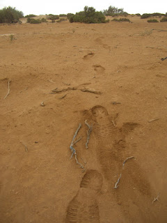 Die Mini-Sanddünen, die hinter sogar hinter den kleinen Büschen anwachsen, haben aufgrund des heftigen Windes eine beachtliche Länge erreicht. Morgen oder übermorgen weht der Wind wieder aus einer anderen Richtung und die Dünen wechseln ebenfalls ihre Lage. So sieht das Ganze jeden Tag ein wenig anders aus.