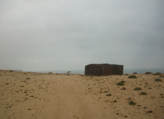 Es wird rasend schnell dunkel und obwohl der Sonnenuntergang noch nicht lang her ist, kommen wir in vollkomener Finsternis an unserem Etappenziel, der Mündung des Draa an. Hoch über dem Draa und damit hoch über dem Atlantik finden wir einen kleinen Platz, der natürlich zu einem Mitlitärposten gehört. Sonst gibt es hier nichts. Wir stehen mit laufenden Motoren noch etwas unschlüssig auf dem Platz herum, als die Tür des bis dahin unbeleuchteten kleinen Hauses aufgeht und zwei Männer auf uns zu kommen. Wir fragen, ob wir hier für eine Nacht stehen können und es ist für sie kein Problem. Sehr gut! Wir versuchen, die Wagen so zu parken, dass es wenigstens einen klitzekleinen Bereich gibt, in dem mal gerade kein Sturm einem das Hirn ´rauspustet. Irgendwie nicht besonders erfolgreich. Egal. Hauptsache, wir haben einen guten Schlafplatz.