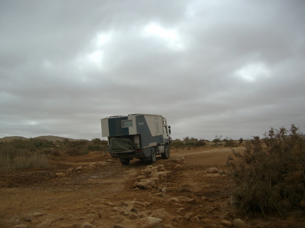 Das scheint Emiline und Olivier allerdings nicht so wichtig zu sein. Nach kurzer Beratschlagung setzten sie in der Dunkelheit die Fahrt nach Tan-Tan fort. Immerhin noch unfgefähr 3 Stunden Fahrt. Warum man das macht, bleibt uns ein Rätsel. Aber vielleicht liegt es daran, das Olivier Reisebusfahrer ist und die sind ja einiges gewöhnt.