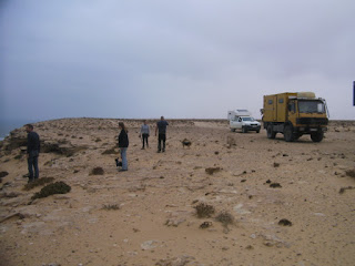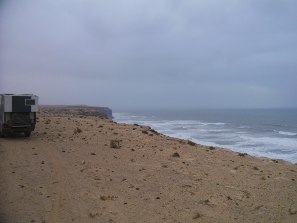 Es wird rasend schnell dunkel und obwohl der Sonnenuntergang noch nicht lang her ist, kommen wir in vollkomener Finsternis an unserem Etappenziel, der Mündung des Draa an. Hoch über dem Draa und damit hoch über dem Atlantik finden wir einen kleinen Platz, der natürlich zu einem Mitlitärposten gehört. Sonst gibt es hier nichts. Wir stehen mit laufenden Motoren noch etwas unschlüssig auf dem Platz herum, als die Tür des bis dahin unbeleuchteten kleinen Hauses aufgeht und zwei Männer auf uns zu kommen. Wir fragen, ob wir hier für eine Nacht stehen können und es ist für sie kein Problem. Sehr gut! Wir versuchen, die Wagen so zu parken, dass es wenigstens einen klitzekleinen Bereich gibt, in dem mal gerade kein Sturm einem das Hirn ´rauspustet. Irgendwie nicht besonders erfolgreich. Egal. Hauptsache, wir haben einen guten Schlafplatz.