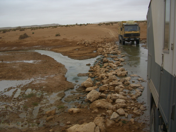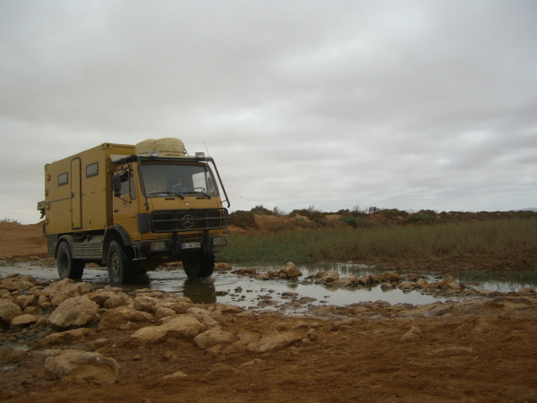 Nachdem wir am nächsten Morgen die unglaublichen Ausmaße der Flussmündung von hier oben bewundert haben, machen auch wir uns auf die Fahrt nach Tan.-Tan. So verlassen wir den Atlantik und folgen dem Fluss in Landesinnere. Erst weit im Inland besteht die Möglichkeit, den Draa südwärts zu überqueren.