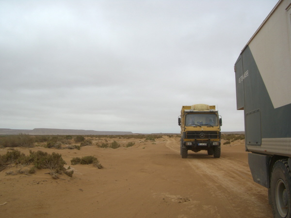 Wir verlassen die Flussmündung jetzt in Richtung Süden und werden oberhalb des Plage Blanche bis Tan-Tan fahren. Ein bisschen was haben wir also noch vor uns. Ausserdem soll die Piste ab hier oft sehr sandig sein und wir wissen nicht, wie hoch die Sandflächen vom starken Wind aufgetürmt worden sind, so dass wir mit einer längeren Fahrtzeit rechnen. Nachdem wir die beiden Franzosen Emiline und Olivier ja hier bei Mustafa wiedergetroffen haben, entscheiden sie sich dafür, sich lieber uns anzuschließen, da auch die beiden nicht wissen, wie gut oder schlecht Ihr Fahrzeug den Sand meistert. Sollte man sich wirklich eingraben, ist es ntürlich ganz schön, wenn man durch andere herausgezogen werden kann. Also geht es jetzt mit 3 Fahrzeugen wieiter.