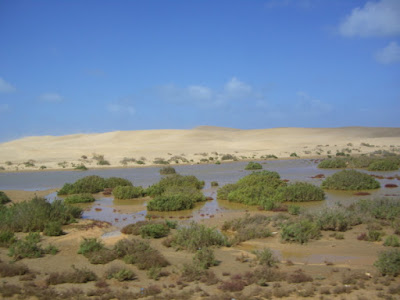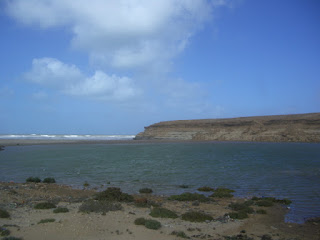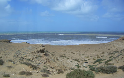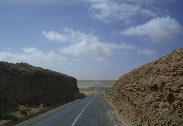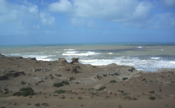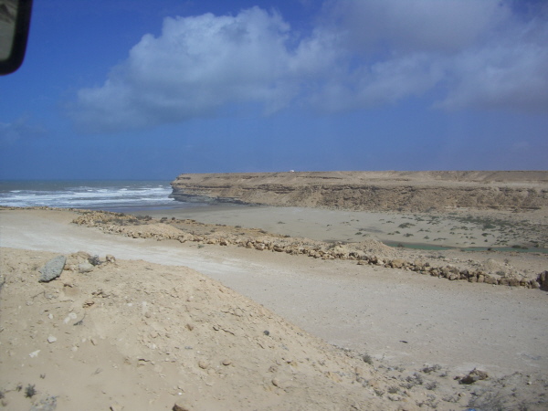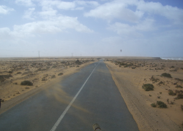 Auf der schnurgeraden Strecke kommen uns kaum noch Privatwagen entgegen. Wenn überhaup, fahren hier die großen LKW, die den Süden versorgen, Links neben uns erstreckt sich die Wüste während rechts von und der starke Wind immer noch das Meer aufwühlt.