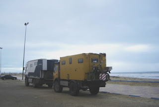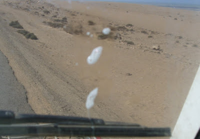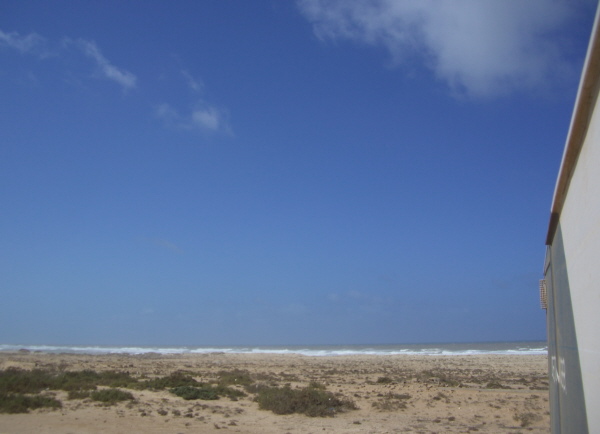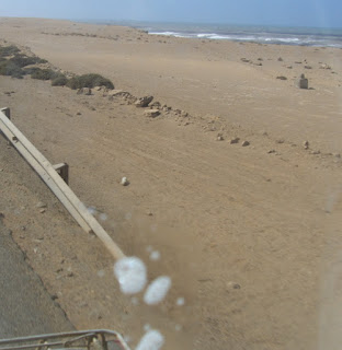 Also fahren wir mit zur Hälfte gefüllten Tanks (ein wenig wollen wir in der Wüste auch auf das Gewicht achten) weiter die Küste entlang und der Wind wird immer heftiger. Mittlerweile schafft er es sogar, die Schaumkronen von den Wellen zu reißen und die Flocken bis auf unsere Windschutzscheibe zu treiben, obwohl wir noch mindestens 150 Meter von der Küstenlinie entfernt sind.