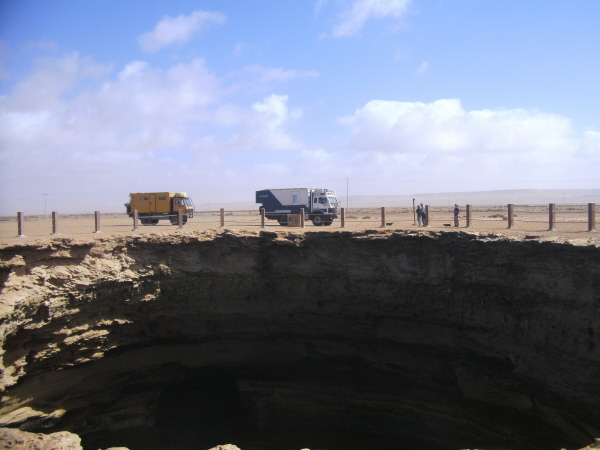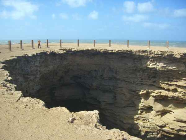 Auf Arabisch ist auf einer Tafel etwas zu dem Naturphänomen erklärt, was wir natürlich nicht lesen können aber wir sehen ja auch so, worum es sich handelt: das Meer hat hier eine ziemlich große Höhle ins Gestein gegraben und da das Gestein hier nicht besonders stabil ist, hat irgendwann die Höhlendecke nicht mehr gehalten und ist eingestürzt. Ergebnis: ein Loch von sicher 50 Metern Durchmesser durch das man die unten liegende Wasseroberfläche sehen kann. Ein faszinierender Ort. Allerdings auch ziemlich stürmisch. Wir umrunden trotzdem das riesige Nichts und bestaunen es gebührend von allen Seiten.