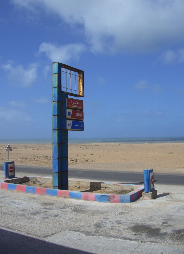 Dann taucht vor uns der erste Polizeiposten nach Tan-Tan auf. Hier müssen wir nun doch halten. Im restlichen Land wurden Touristen nur durchgewunken. Aber ab hier will man aus Sicherheitsgründen wissen, wo die wenigen Touris wie wir sich gerade befinden und die Daten werden akribisch aufgenommen. Uns soll´s recht sein…Der Posten verabschiedet uns nach erfolgter Kontrolle und nach wenigen hundert Metern taucht die erste Tankstelle mit „Saharasprit“ auf – genaugenommen sind es drei Tankstellen und sie wirken wie aus einem Weltuntergangsfilm Film gefallen: Das leicht diffuse Licht auf der Wüste hinter den schäbigen Gebäuden und der Sand, der vom stürmischen Wind über die Straße und durch die Luft gepeitscht wird, verstärken den Eindruck noch.