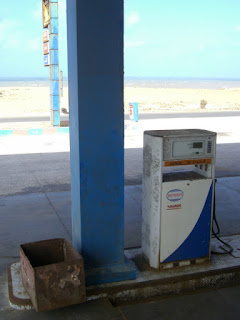 Trotz der etwas apokalyptischen Szenerie tanken wir natürlich mit Freude den günstigen Sprit: Rund 40 €-Cent bezahlen wir. SO lassen sich auch große Strecken ohne Loch in der Kasse überstehen.