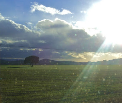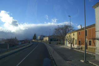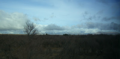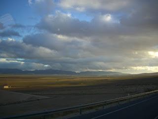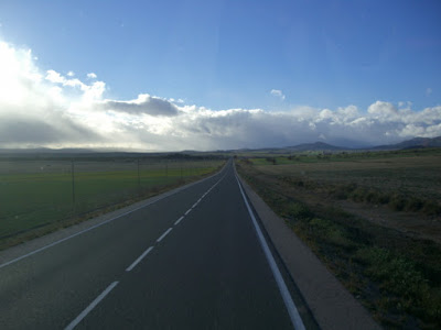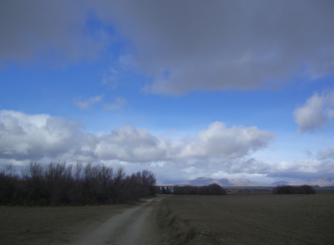 Die Sonne, die die Luft bisher auf angenehme 15-16 Grad erwärmt hatte und kräftig durch unsere Frontscheibe schien, drohte hinter dieser verdächtig aussehenden Wolkenbank zu verschwinden. Aber zunächst führte die Straße erst einmal von dieser grauen Wand weg und es geschah erst einmal nichts Besonderes – unser Weg führte durch eine weite, fast menschenleer wirkende Landschaft.