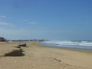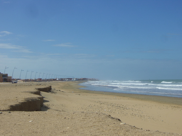 Da es aber nun auch schon wieder später Nachmittag ist, brauchen wir nun noch einen Stellplatz für die Nacht. Ralph und Birgit haben sich telefonisch gemeldet, dass sie 20 km westlich der Stadt einen Platz am Strand gefunden haben. Dorthin fahren wir und nach den Mühen der letzten 2 Tage, gibt Ralph uns noch ein Bier (!) aus seinem Marokkovorrat aus. Das ham wir uns verdient! Wir genießen – so gut- es bei dem Wind geht – die kurze Abenddämmerung und reden noch ein wenig über unsere jeweil sehr unterschiedlichen Erlebnisse der letzten beiden Tage bis der jetzt kühle Meerreswind uns in unsere Unterkünfte treibt