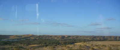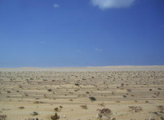 Ein paar Kilometer weiter sind die hohen Dünen nicht nur am Strand sondern auch direkt neben der Straße zu finden und die meterlangen Sandfahnen hinter den kleinen Büschen geben eine nettes Bild ab.