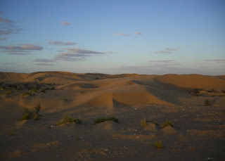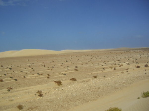 Kurz vor Laayoune durchzieht die Wüste ein Feuchtgebiet und die Büsche werden von etwas bizarr geformten Sandhügeln umgeben. Schön anzusehen in dem seltsamen „SandLicht“.