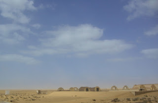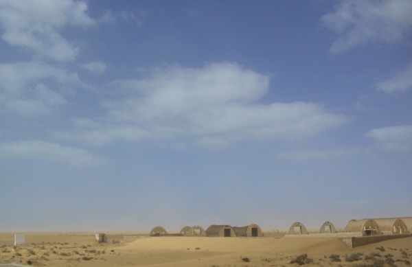 Halbverfallene Hangar (wie ist eigentlich die Mehrzahl von Hangar???) im Wüstensand