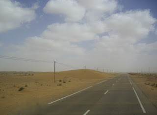 Der Sturm schiebt in unverminderter Stärke die Sandfahnen über die Straße und die Dünen am Strand sind hier nun schon so hoch, das wir das Meer dahinter nicht mehr sehen können. Entsprechend viel Sand zum Umverteilen steht dem Wind zur Verfügung und er macht reichlich Gebrauch davon.