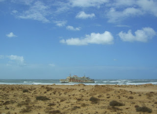Wir kommen also zwangsläufig kurz hinter dem Ortsausgang wieder an der alten Fähre vorbei, die erstaunlicherweise in den Sturmwellen immer noch nicht zerbrochen ist.