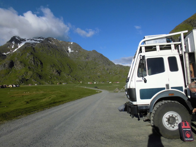 Auf der Fahrt dorthin machen wir einen Übernachtungsstop gegenüber des berühmten “Trollfjordes”, dem die Schiffe der Hurtigruten durch den nur 70 Meter breiten Eingang manövrieren, um dann zwischen den steilen Felswänden auf der Stellen zu wenden. Soll ein Highlight auf den Fahrten sein. Wir hatten leider Regen und schlechte Sicht und konnten daher nicht in den engen Fjord blicken.