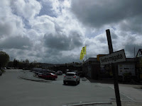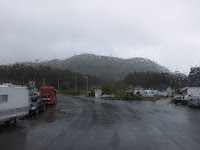 Bei den tiefhängenden Wolken sieht man von der Berglandschaft leider kaum etwas, so dass wir in der nächsten Ortschaft mit Namen Berg stehen bleiben und mit der Aussicht auf einen „Einkaufenladen“ und einen völlig wolkenverhangenen Berg für heute Schluss machen mit dem Fahren.