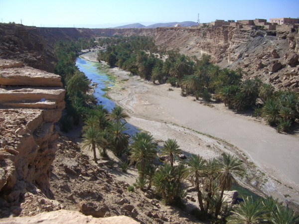 Bald schon ist Tissint erreicht und wir suchen in dem sonst ziemlich unauffälligen Ort nach den Kaskaden – in einer kleinen Seitenstraße werden wir fündig. Leider hat es schon länger nicht geregnet, was man den Kaskaden deutlich anmerkt: nur ein kleines Rinnsal plätschert vor sich hin und der Parkplatz lädt uns auch nicht zum Verweilen ein. So begnügen wir uns mit ein paart Fotos und fahren dann weiter