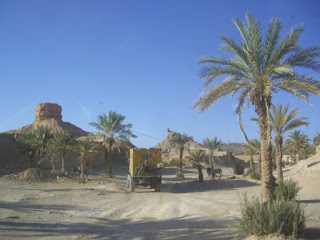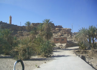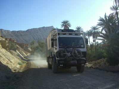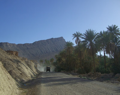 Das Dorf liegt in einer Oase und zwischen Lehmhütten und Palmen wird es für uns langsam etwas eng. Wenig später führt der Weg in den Palmenhain und ist ab da deutlich schmal für uns, so dass wir unter dem großen Hallo der Dorfkinder umdrehen und den Rückweg antreten.