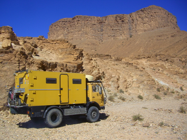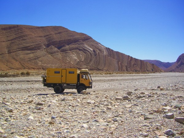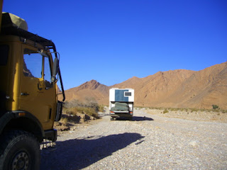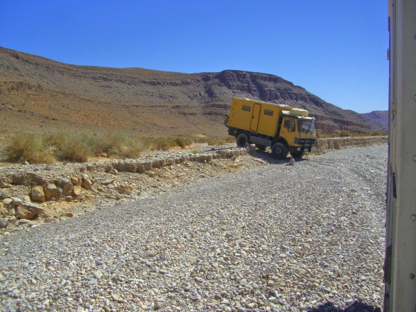Wir kommen an den von uns gesuchten Abzweig von der Schotterstrecke. Hier beginnt die eigentliche Piste, die uns rund 35 Kilometer auf völlig unbefestigten Wegen durch das breite, kiesbedeckte Flussbett des Oued Tamanarte führen wird. Meist sind diese Pisten ausschließlich von Landrovern und Co. befahren aber wir wissen von Marc und Doro, dass man auf diese Flusspiste zumindest mal mit einem 9 Tonner Steyr befahren kann (herzlichen Dank noch einmal für den Tipp, Marc!). So wollen wir uns an diese Strecke wagen und begeben uns in das Kiesbett. Unsere digitale Karte wird uns auf dem richtigen Weg halten, denn nicht immer wird der befahrbare Weg vor uns zu sehen sein. Auch die immer wieder aufgebauten Steinmännchen sind nicht immer verlässlich/vorhanden, weil sich die Streckenfüfrung durch natürliche Einflüsse immer wieder einmal ändert.