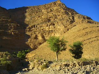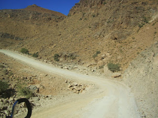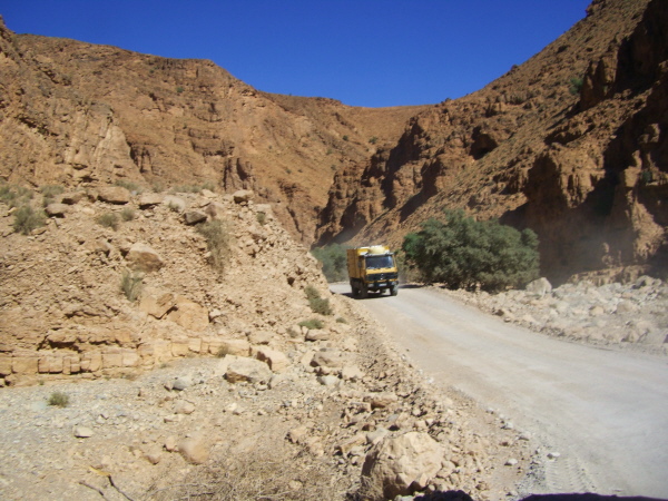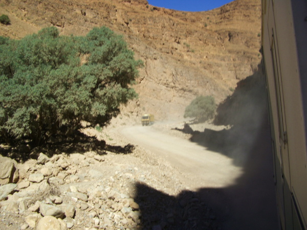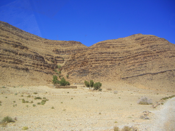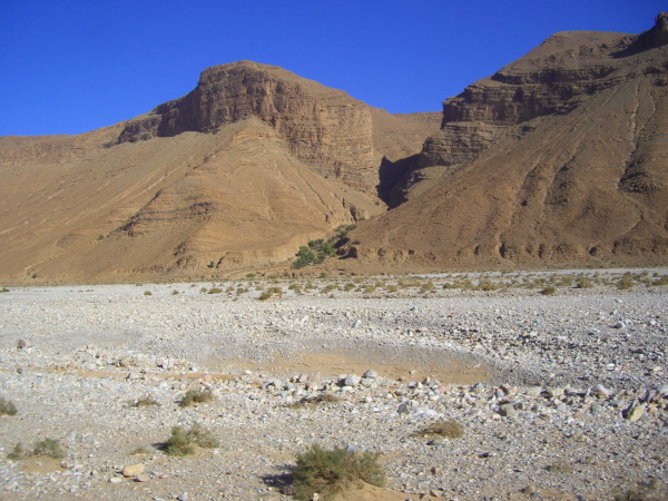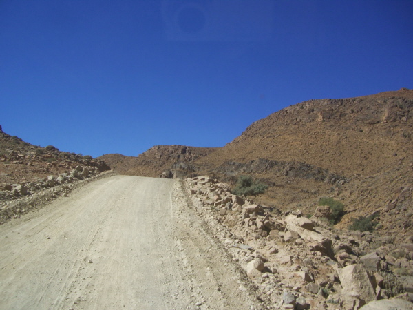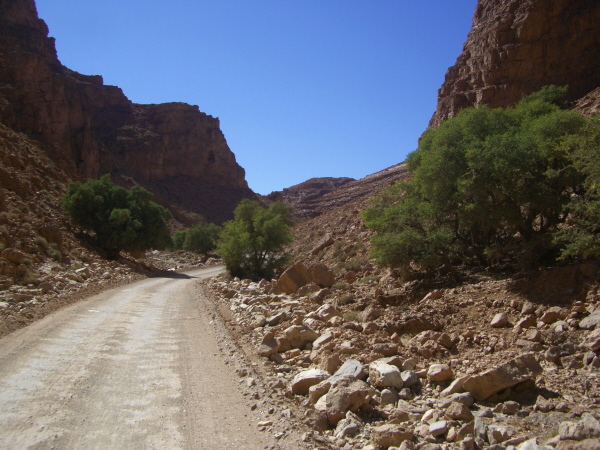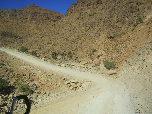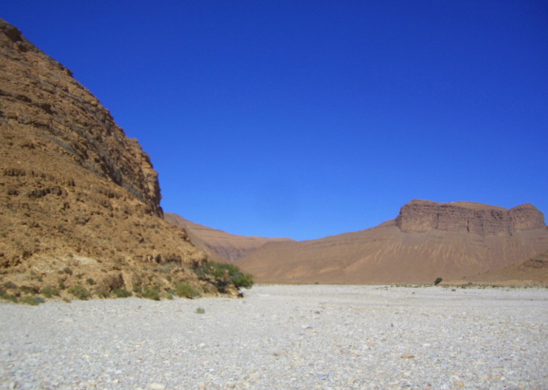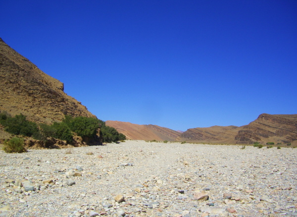 Das Flußtal wird langsam immer breiter und die Berghänge rechts und links nicht mehr ganz so steil und hoch. Wir fahren flußaufwärts und ab hier teilt sich der Weg – zwei Hauptzuflüssen des Oued Tamanarte folgend. An diesen Zuflüssen verlaufen jeweils Schotterstraßen und wir entscheiden uns für den linken der beiden Zuflüsse. Das  breite Kiesbett verlassen wir nun und fahren auf ungewohnt glatter Schotterstrecke weiter.