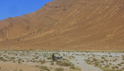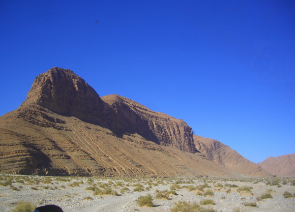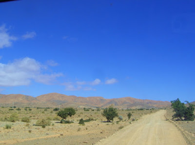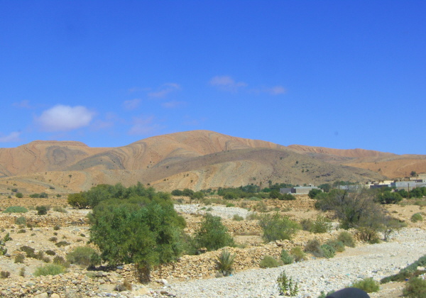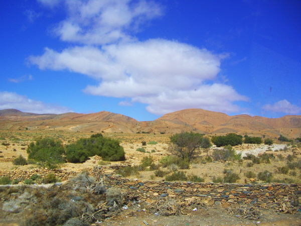 Nach einer guten Stunde Fahrt sehen wir in der Entfernung die Berge, hinter denen Tafraoute liegt: wir wollen wieder in die Nähe fahre: zu den “Blauen Steinen”, um dort bis morgen Pause zu machen und unsere Wasservorräte aufzufüllen…