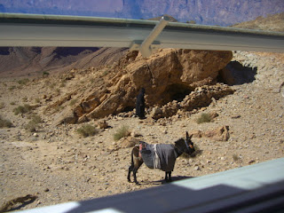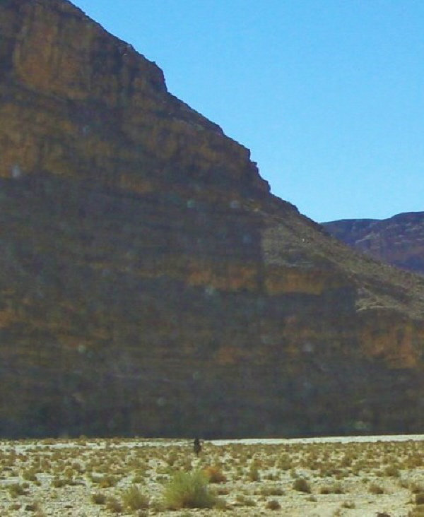 Und so sind wir drinnen noch bei den letzten Bissen als wir einen einsamen Eselreiter auf unsere Autos zukommen sehen (wo auch immer der herkommt) – er steigt neben uns ab und scheint an einem nahen Felsüberhang etwas zu überprüfen. Ralph steht schon vor seinem Fahrzeug und der Eselreiter spricht ihn an – da Ralph ja schon mehrfach sein Talent in Sachen sprachenübergreifender Kommunikation und sozialer Kompetenz bewiesen hat, überlassen wir ihm das Feld. Nach einer Weile kommt Ralph zu uns und fragt, ob wir ein T-Shirt übrig hätten, das wir dem Mann überlassen könnten. Der Eselreiter hat sich bei Ralph wohl darüber beschwert, dass wir hier auf seinem Feld stehen (in einem Flussbett????). Eine Diskussion darüber ist mit dem ausschließlich arabisch sprechenden Mann sicher nicht möglich und außerdem wollen wir ihn ja auch nicht verärgern. So bekommt er von Ralph zur Besänftigung eine Sonnenbrille aus seinem Fundus und ein T-Shirt von Maik geschenkt. Beides nimmt er mehr oder weniger versöhnt entgegen und zockelt auf seinem Grautier von dannen. Er hinterlässt uns etwas ratlos: wer baut hier in dem Kiesbett eines Flusses irgendetwas an? Und von allem was? Vielleicht auch wieder Steine? Wir kommen zu dem Schluss, dass es sich bei dem Eselreiter vermutlich um Barney Geröllheimer handelt (ohne ihm nahetreten zu wollen, versteht sich) und wir verlassen natürlich umgehend sein Grundstück…