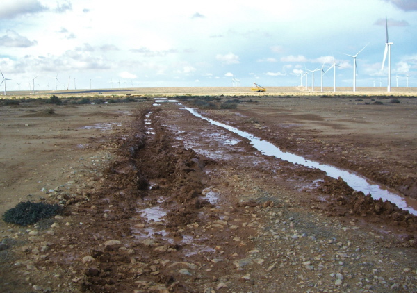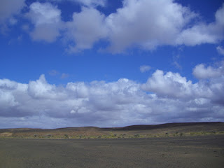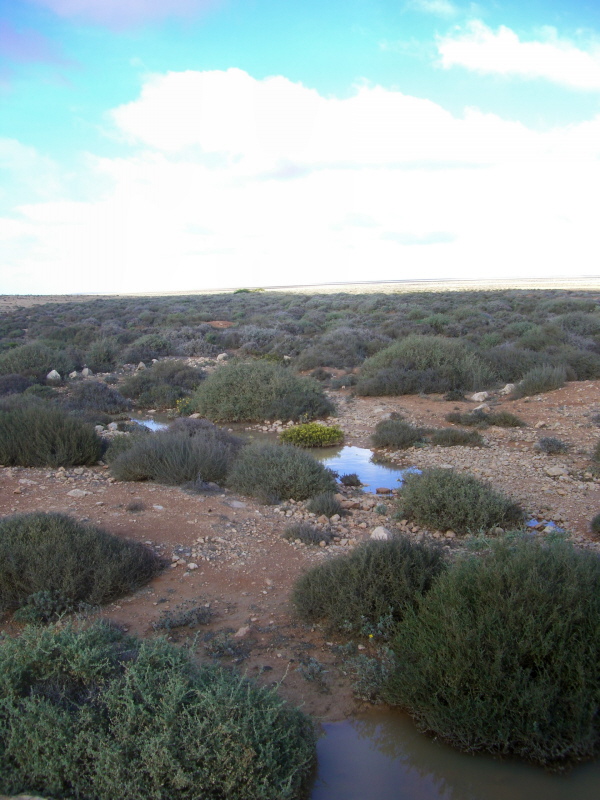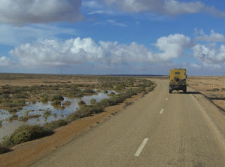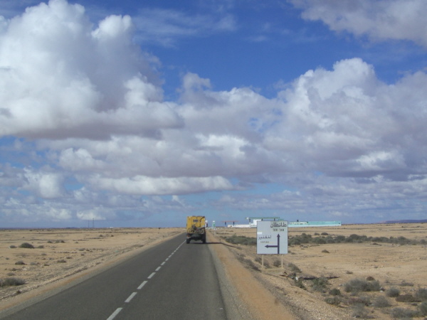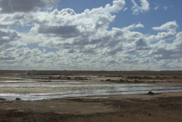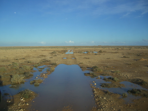 Hier hat es in den letzten Tagen offensichtlich kräftiger geregnet, als in der Gegend um Es Smara. Auf dem Wüstenboden haben sich flache Seenlandschaften gebildet.