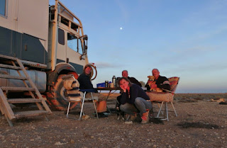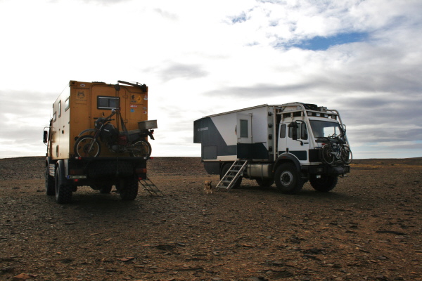 Da wir den Platz aufgesucht haben, als es bereits dunkel war, sind wir nun am Morgen einigermaßen überrascht von der völlig neuen Umgebung: gestern sind wir noch durch helle Geröllwüste gefahren, in der wir sogar den ein oder anderen Baum sehen konnten und heute finden wir uns in einer Art Mondlandschaft wieder: