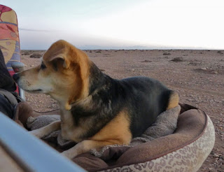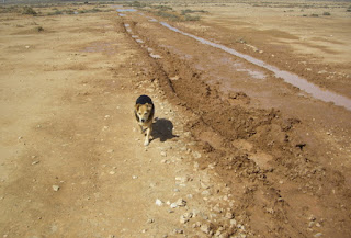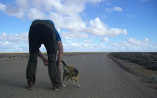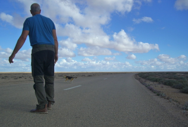 Pause auf der menschen- und damit autoleeren Straße. Schließlich sind wir ja schon wieder zwei Stunden oder mehr unterwegs…Lotta freut´s! Dem Ball nachjagen kann man auf dem glatten Asphalt schließlich viel besser als auf dem Wüstenboden, auf dem alle Nase lang irgendwas Stacheliges oder Pieksendes ´rumliegt und einem in Pfoten sticht. Also los geht´s!!