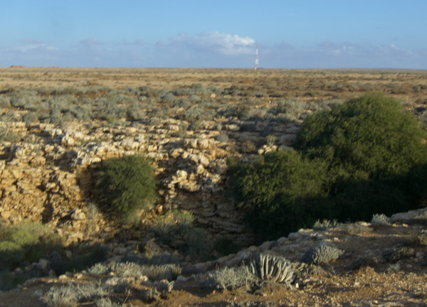 Wenige Kilometer nördlich der Stadt kommen wir an einem offensichtlich nie in Betrieb genommenen Campingplatz vorbei. Ein Hinweisschild rostet zwar noch irgendwo vor sich hin aber der Blick in das Innere der (teilweise schon wieder eingefallenen) Mauer verrät uns, das der völlig versandete Platz nie wirklich in Benutzung war.