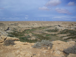 Aber die Windräder kommen uns doch bekannt vor – und das tiefe Tal, in das wir jetzt auf der rechten Seite schauen können, haben wir auch schon mal gesehen: das Tal, in das wir – von der Atlantikseite kommend – schon einmal hineingeschaut haben. Aber einen Wasserfall haben wir damals nicht gesehen.