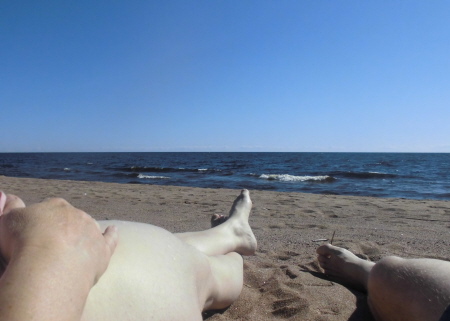 Nicht mehr weit uns wir finden an den Ufern des größten europäischen Sees einen wundervollen Platz im tiefen Sand mit schattigen Kiefern und tollem Blick auf den See.