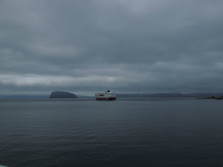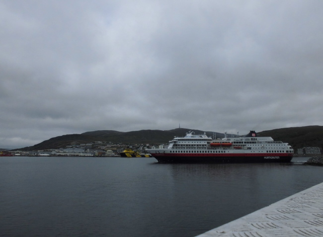 Und am nächsten Morgen ist auch wieder ein Schiff der allgegenwärtigen Hurtigruten da, schleicht sich in vielleicht 100 Metern Abstand an uns vorbei