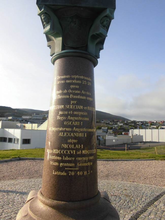 Sie erinnert an ein gemeinsames Projekt von Schweden, Russland und Norwegen: Ab 1816 wurde unter Leitung des deutschen Geophysikers F.G. Wilhelm von Struve die Vermessung des Erdumfanges anhand von Landpunkten durchgeführt. Dieser “Struve-Bogen” aus 265 Vermessungspunkten beginnt in Hammerfest und endet nach 2.820 Kilometern im Donau-Delta am Schwarzen Meer