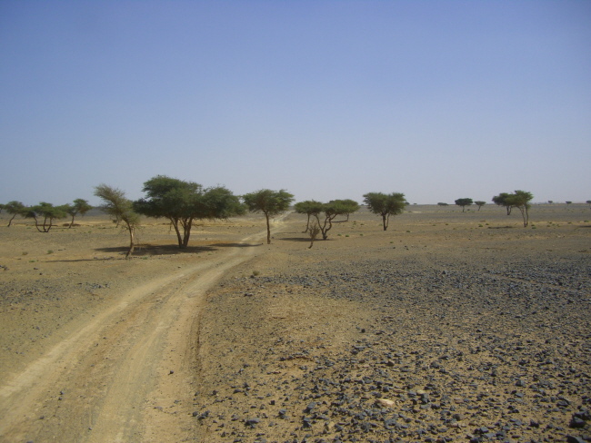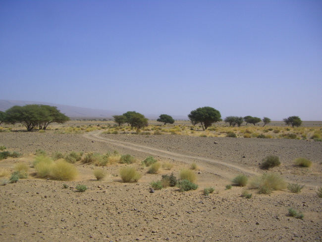 Kurz hinter dem kleinen Ort verschwinden die Bäume aus der Landschaft und auch die Geröllfelder ändern sich: die großen, abgerundeten Steine werden jetzt durch scharkantige, kleine dunkle Steinfelder ersetzt – sieht etwas trostlos aus. Aber in der Ferne kann man schon die gelben Dünen erkennen, die uns zur Erg Chegaga begleiten werden