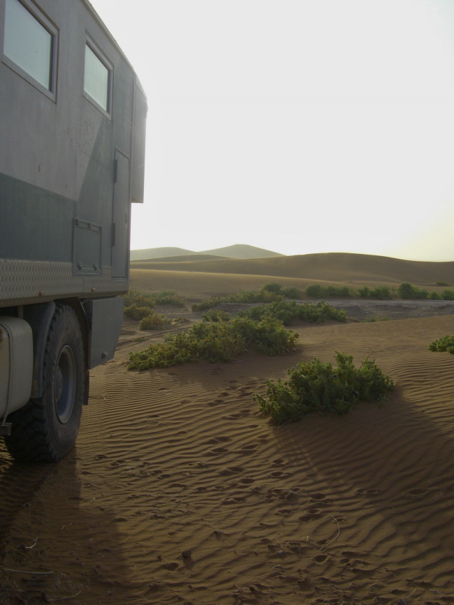 Der Sternwanderer “schwimmt” im Sand, noch haben wir keine Luft abgelassen, sondern versuchen zunächst mit erhöhter Geschwindigkeit durch den zunehmend tiefer werdenden Sand zu kommen. Der Sternwanderer hat mit großen Hubraum viel Schubkraft in unteren Drehzahlen. Die 13 Tonnen machen es dennoch nicht einfacher. Der Steppenwolf ist deutlich leichter und hat einen Turbomotor, braucht also höhere Drehzahlen und fährt sich einfacher, wenn er entsprechend schneller unterwegs ist.