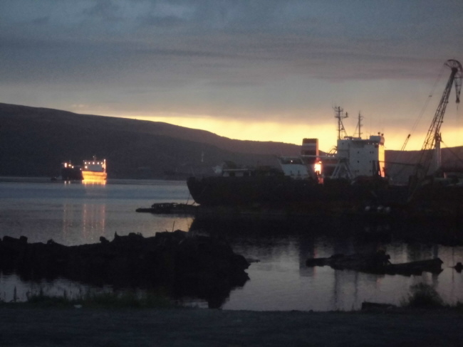 | Das Weiße im Hintergrund sind die bebauten Hügel des Murmansk-Fjordes |