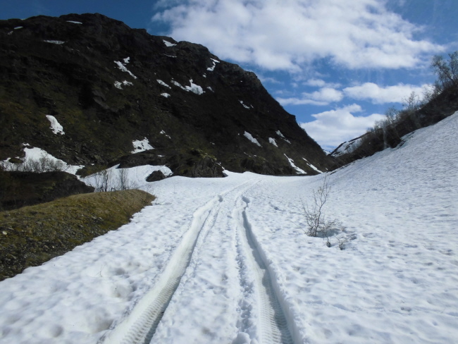 In Fykan gleich hinter einem Tunnel finden wir den Abzweig. Es ist eine ehemalige Versorgungsstrasse für zwei in den Bergen liegende Staudämme und wir fahren die 9 km bis zum Ende auf rund 1000m über NN. Der Anstieg ist recht steil und führt durch zwei abenteuerlich enge und stockdunkle Tunnel. Wir sind heilfroh über die “Flutlichtanlage” des Sternwanderers und keuchen im 2. Gang bergan.