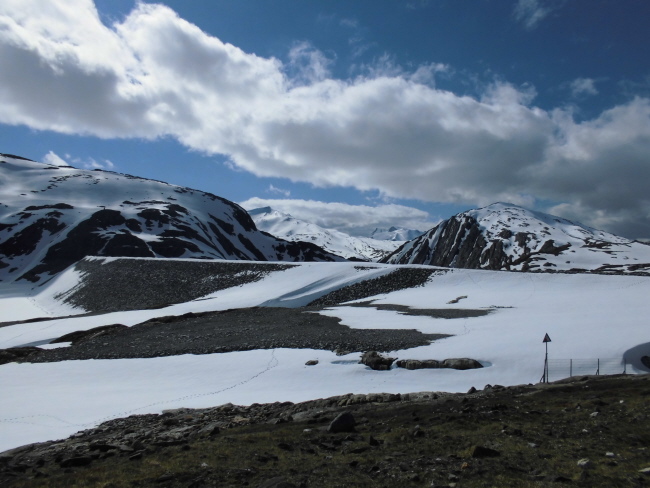 Die Strasse endet vor einem Schneefeld am Fuße der Staumauer. Gleich daneben befindet sich ein Parkplatz auf dem wir einen unglaublichen Ausblick auf die schneebedeckten Berge rundherum haben.