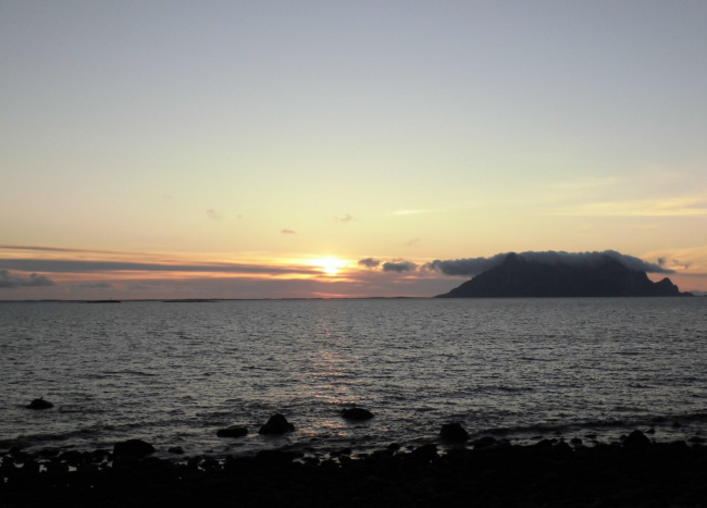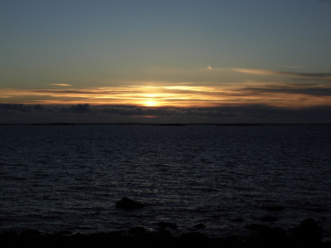Von hier aus hat man einen wunderbar freien Blick auf die Mitternachtssonne. Leider haben sich doch noch ein paar Wolken vor den tiefsten Stand der Sonne geschoben aber man sieht deutlich, dass sie nicht hinter dem Horizont verschwindet und nachts um 2 Uhr schon wieder oben aus der Wolkendecke lugt.