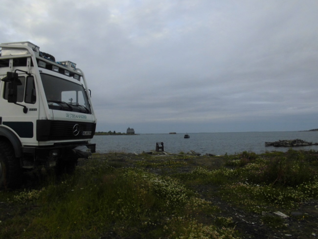 Also hieß es, einen Übernachtungsplatz zu suchen: die Strasse endete hinter dem Ort direkt am Weissen Meer. Dort wollten wir hin und durchfuhren so erstmal den gesamten Ort, um einen tollen Platz direkt am Ufer dieser eiskalten Gewässer zu finden: