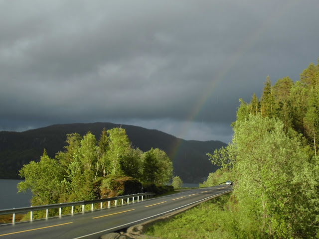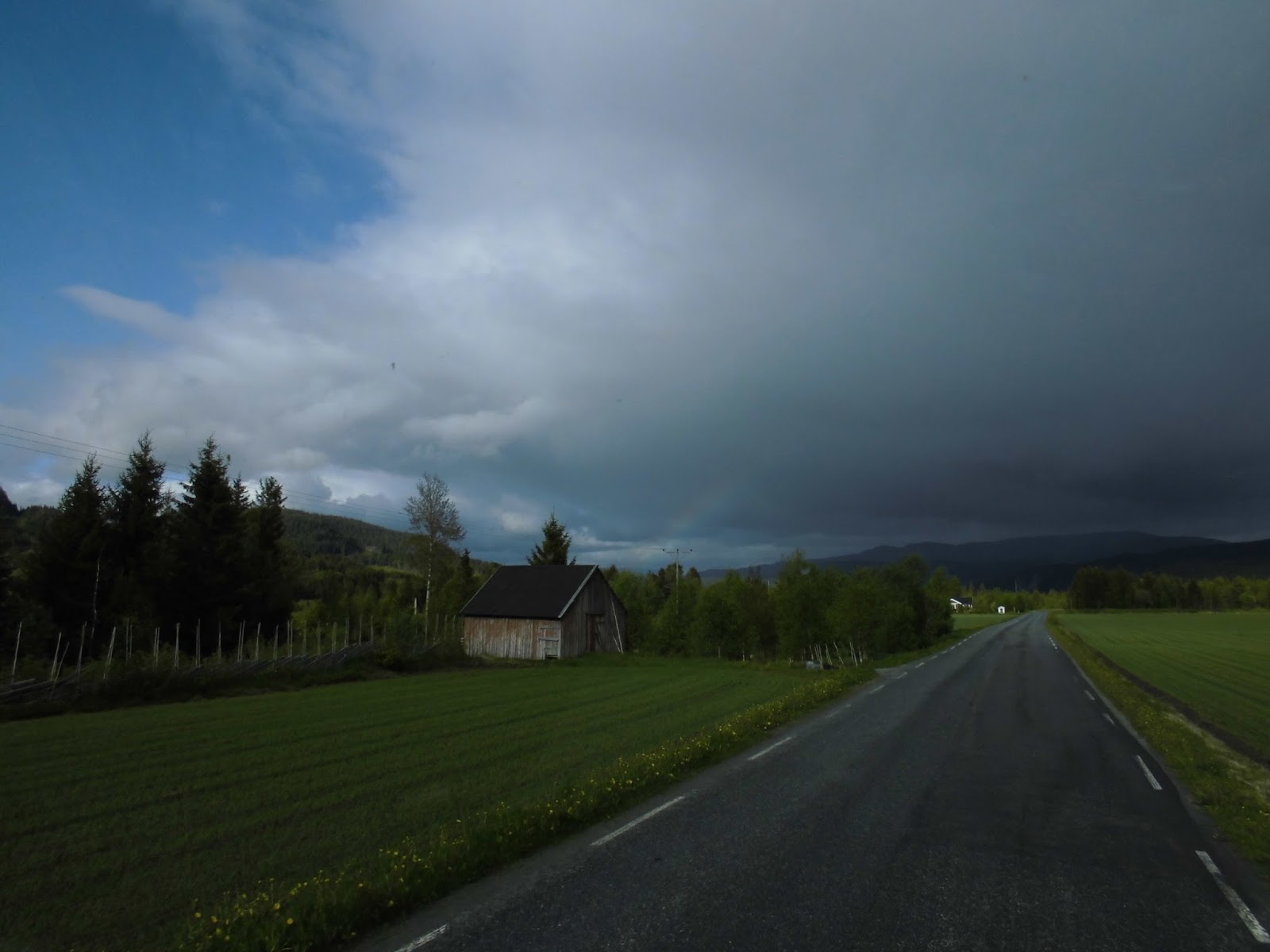 Abends haben wir nach längerer Suche direkt am Foldafjord einen Schlafplatz gefunden, der einen wunderschönen Blick auf den Fjord bietet – sogar mit Regenbogen!