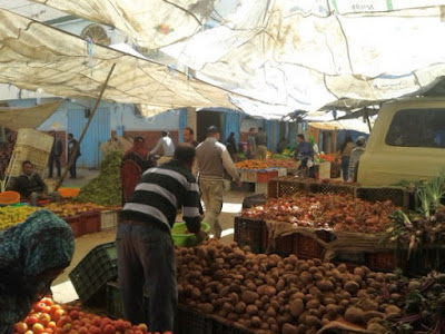 Im Gegensatz zu unserem letzten Besuch statten wir diesmal auch dem örtlichen Souk einen Besuch ab, um Gemüse, Eier und Oliven zu kaufen. Immer wieder erstaunlich, welche Mengen von Gemüse hier angeboten werden. Da jeder der mindestens 20 Händler ein sehr ähnliches Sortiment hat, fragen wir uns: wo sind die ganzen Leute, die das viele Gemüse kaufen?? Wir bekommen es wohl nicht heraus. Macht auch nix. Wir schauen uns jedenfalls ein wenig um und sorgen für Proviantaufstockung, bevor wir weiter nach Norden fahren.