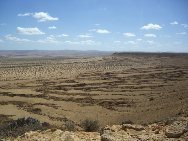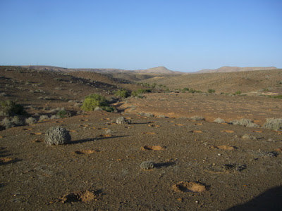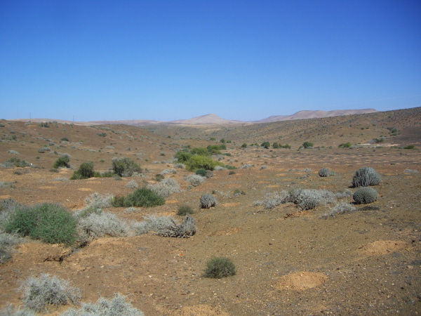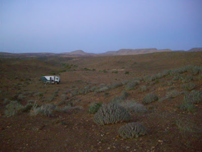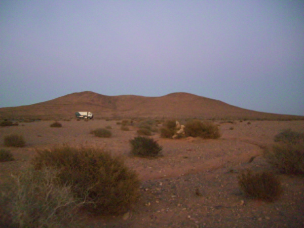 Am nächsten Morgen wachen wir bei strahlend blauem Himmel am Rande der Hochebene auf. Ein letzter Blick noch von hier oben in das Tal, in das wir nun hinunterfahren werden, um nach Tan-Tan zu kommen.