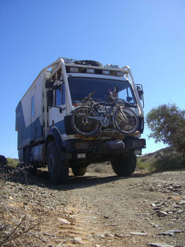 etwas gefolgt sind, sehen wir, wohin uns diese Piste bringen wird: sie verläuft wenig später an einem Steilhang und ab hier ist der Weg breit genug für einen Landrover – für uns wird es dann doch ziemlich eng. Vielleicht könnten wir es trotzdem versuchen aber der Unterbau der Straße, den man gut von der Seite sehen kann, sieht für einen 13-Tonner nicht sehr Vertrauen erweckend aus. (leider gibt es sinnigerweise ausgerechnet hiervon mal kein Foto). Deshalb entschließen wir uns hier zur endgültigen Umkehr. Also wieder ´runter vom Berg.