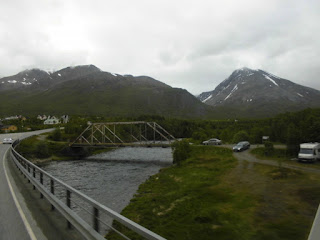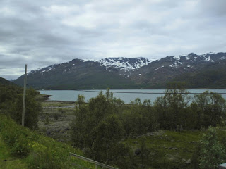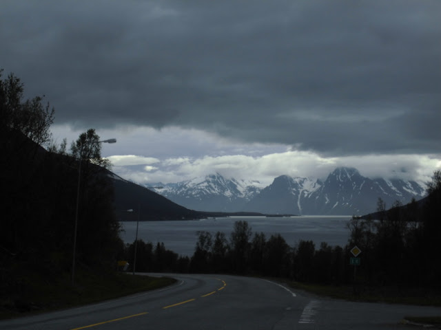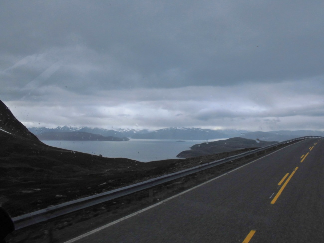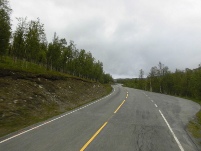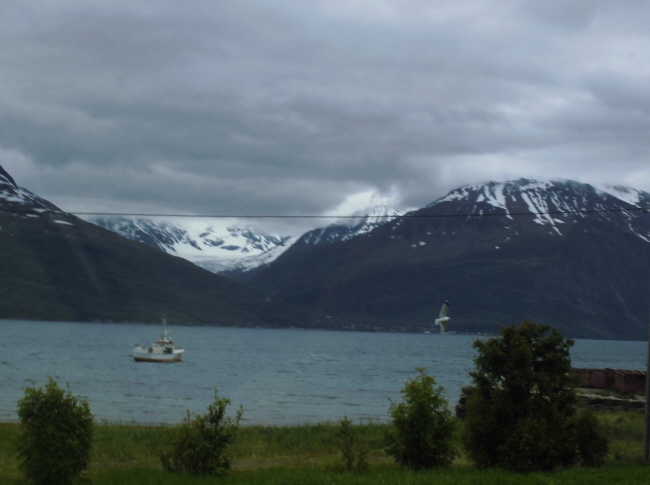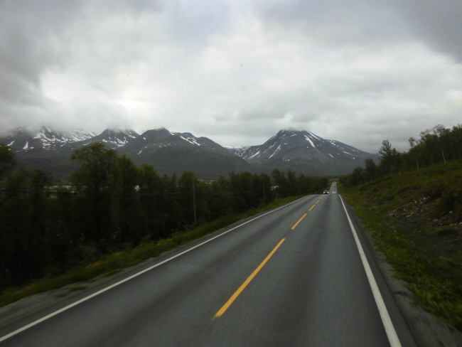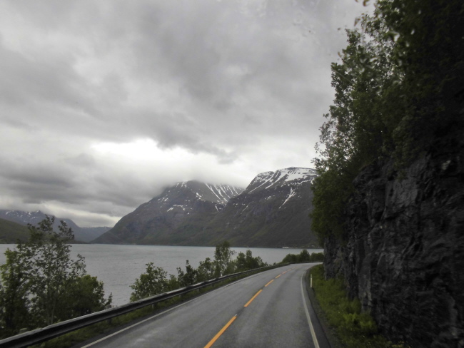 Nach unserem unfreiwilligen zweiten Aufenthalt an unserem Übernachtungsplatz, machen wir uns ein zweites Mal auf den Weg: die Küste entlang Richtung Alta. Heute ist das Wetter auch besser als gestern, wo es auf gleichen dem Wegabschnitt nur geregnet hat (jedenfalls die 70 km, die wir vor dem Umdrehen gefahren sind…). Wir können wir daher jetzt viel mehr von der Landschaft sehen. So hat eben alles auch sein Gutes und wir können entlang des Fjordes die Bergen bewundern, die in der Nacht wirklich noch einmal eine neue Puderzuckerhaube bekommen haben. Man fasst es nicht – Mitte Juli! Na ja, wir sind allerdings ja auch schon ziemlich weit im Norden: vom Nordkapp, also dem 71. Breitengrad und damit dem nördlichsten Punkt Europas trennen uns nur noch 150 km Luftlinie. Allerdings sind das locker die 3 fache Strecke Fahrkilometer. Wird also Zeit, dass wir weiterkommen!