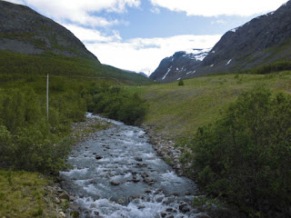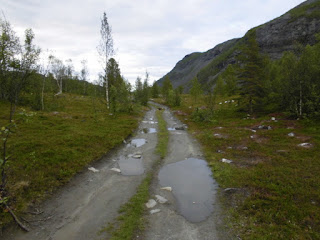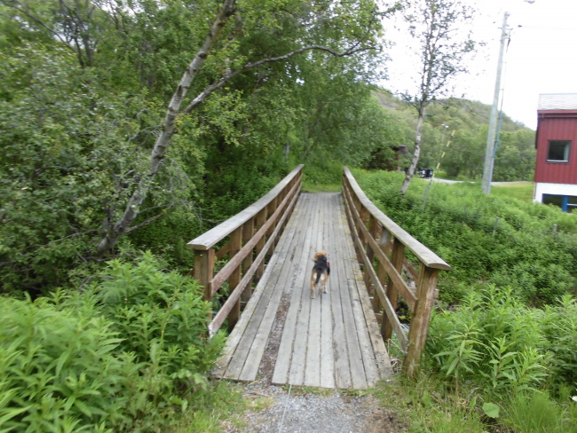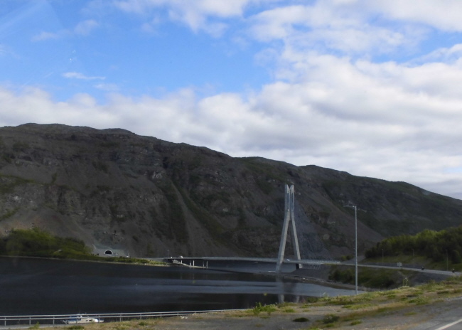 Rund 15 km vor der Stadt liegt der Kafjord mit seiner neuen Brücke, die direkt in einen Tunneleingang führt. Durch den Tunnel kommt man auf kürzestem Wege nach Alta, ohne noch einmal den Anstieg am Ende des Fjordes fahren zu müssen. Da wir aber nicht unbedingt des schnellsten, sondern vor allem des schönsten Weges hier sind, wählen wir den alten Straßenverlauf ohne Tunnel, dafür führt er am Tirpitzmuseum vorbei und am Ende des Fjordes gibt es eine wunderschöne, flache Heidefläche, auf der wir ausgiebig Pause machen.