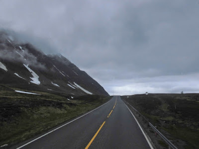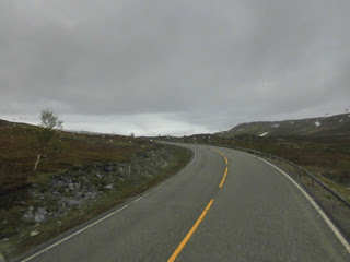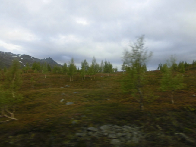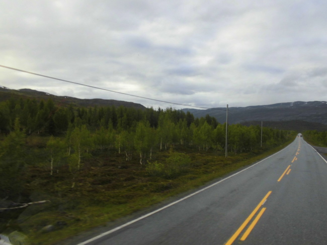 Bevor man den Altafjord erreicht, führt die E6 noch einmal steil hinauf auf eine karge, mit Schneeresten durchsetzte Hochebene, auf der nur die Zwergbirken noch den harten Wetterbedingungen trotzen.